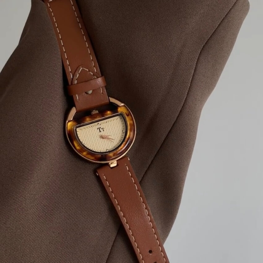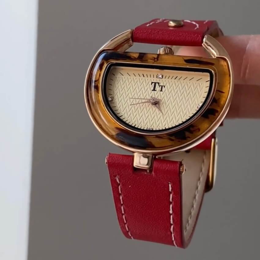 The watch is available in two sophisticated color options—classic red or earthy brown leather straps—both of which offer a luxurious, comfortable fit for all-day wear. The rich leather material not only enhances the visual appeal but also ensures durability and flexibility, complementing the chic design of the semicircular dial. Whether you prefer the striking vibrancy of the red strap or the subtle elegance of brown, both options are perfect for adding a fashionable accent to any outfit.