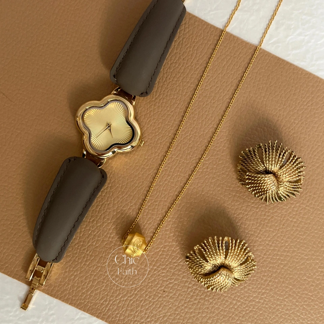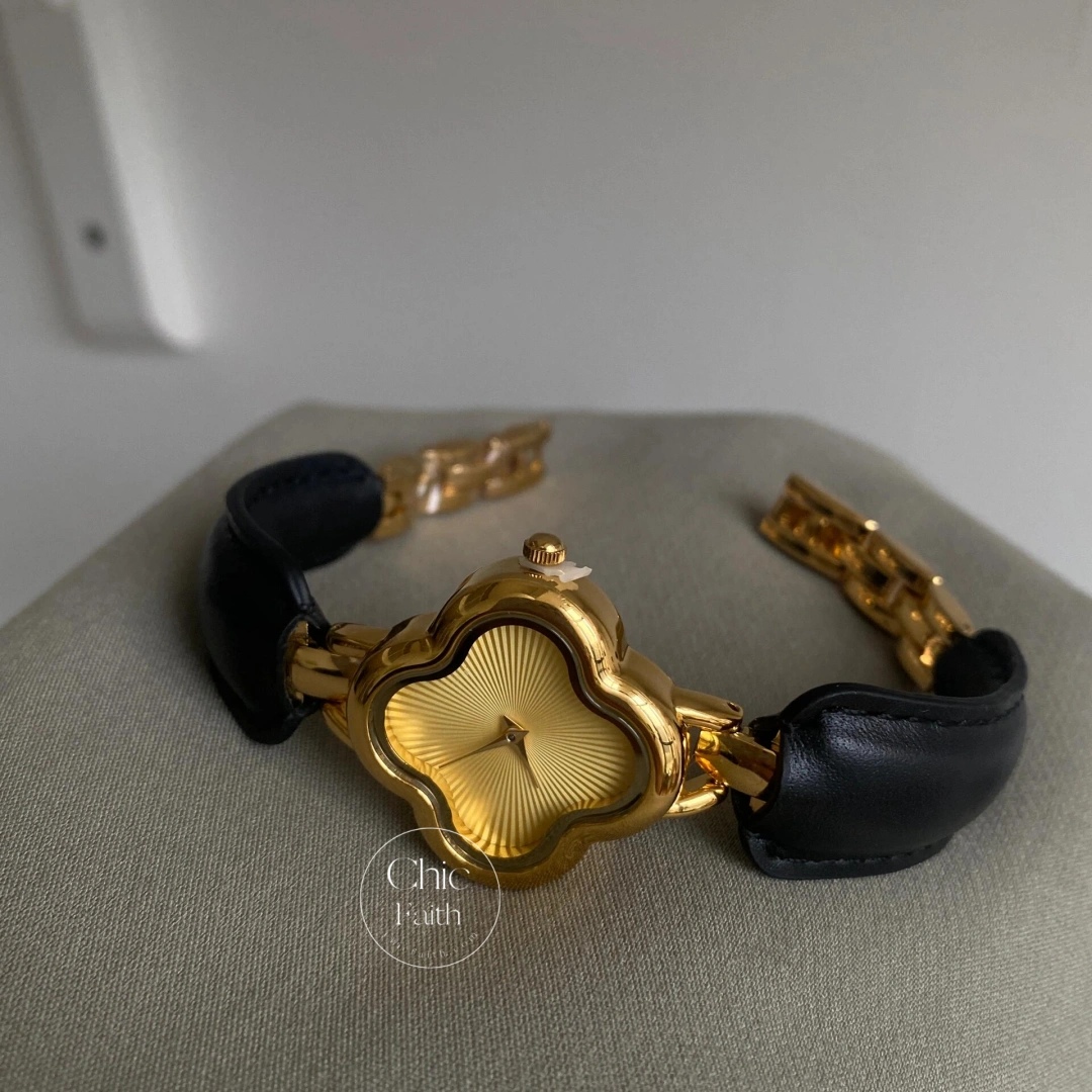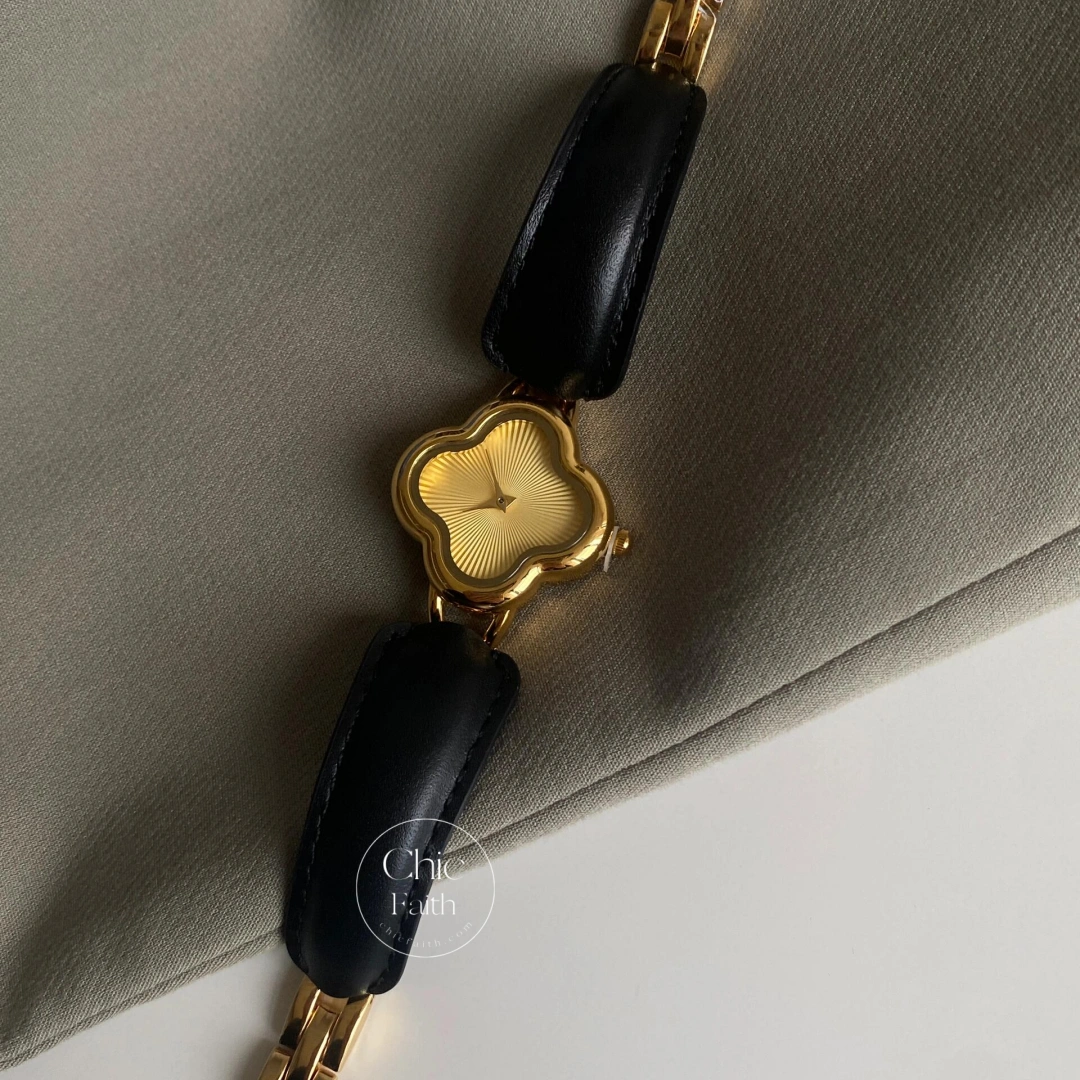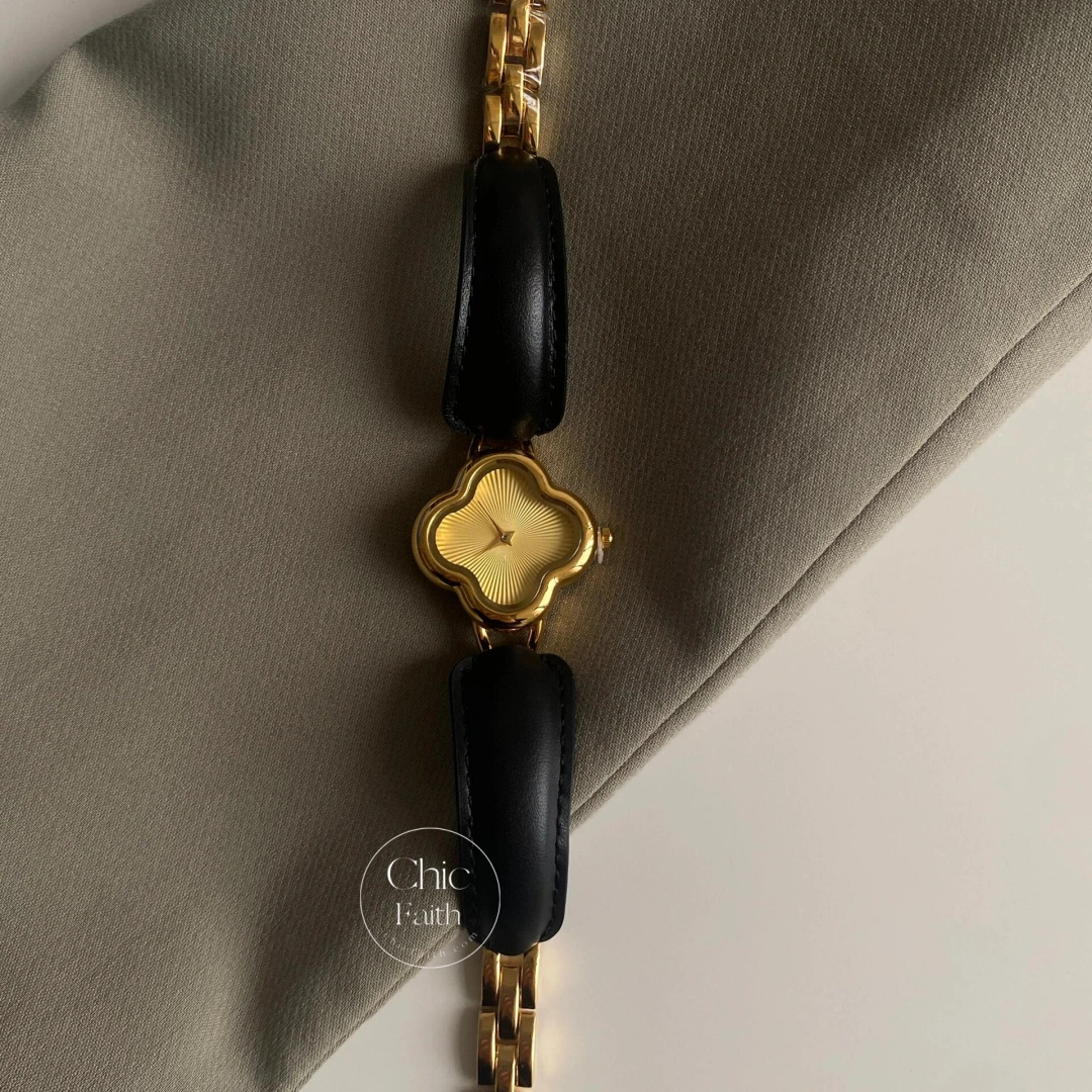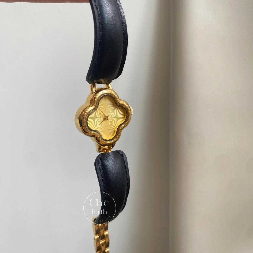 Elevate your everyday elegance with this clover-shaped women’s watch, featuring a deep black dial encased in a luxurious gold-tone frame. The unique four clover case adds a touch of artistic flair, while the burgundy leather strap and gold chain bracelet offer a refined contrast—blending softness and strength.