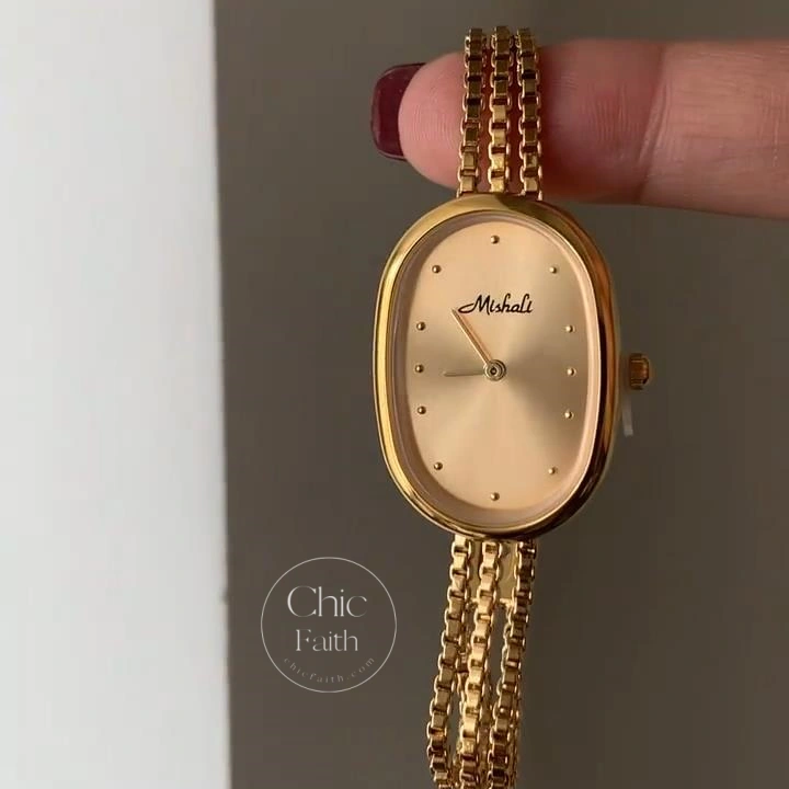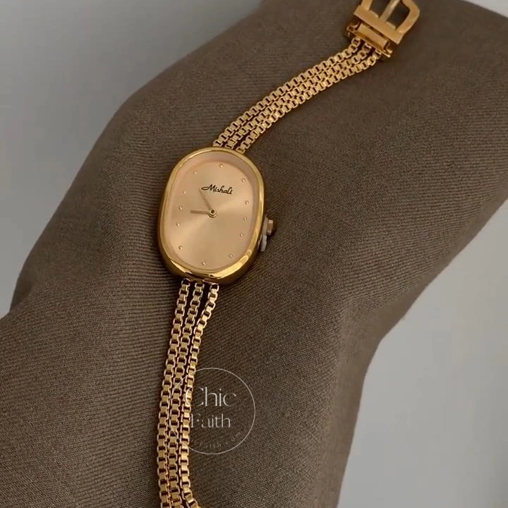 This vintage-inspired oval gold bracelet watch combines timeless charm with a refined minimalist design. Its softly curved oval dial and double-layer chain bracelet create a luxurious jewelry-like look, perfect for women who appreciate subtle elegance.